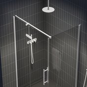 Повернув изделие на 180° получится левый/правый варианты открывания дверей. Изделие состоит из душевой двери и одной неподвижной стенки (форма L). Держатель входит в комплект.