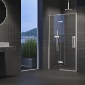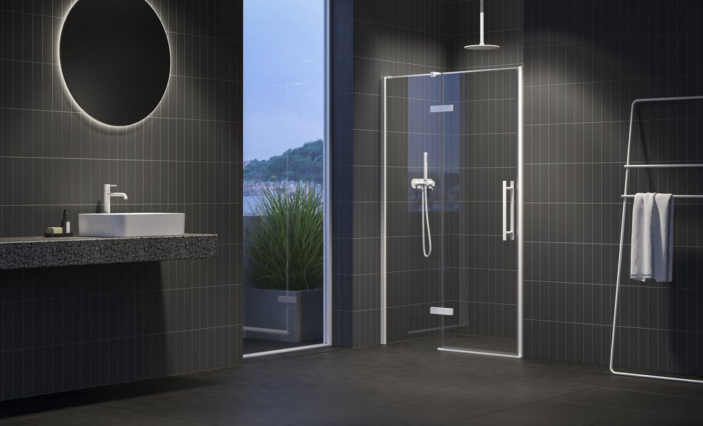 Двухэлементная душевая дверь COOL! в исполнении глянцевый хром или черный. Витраж из прозрачного стекла с защитным слоем RAVAK Anticalc®. Шарнирная система открывания. Поворотный продукт для левой и правой версий. Идеальное решение для создания душевого пространства в нише шириной 100 - 120 cm.