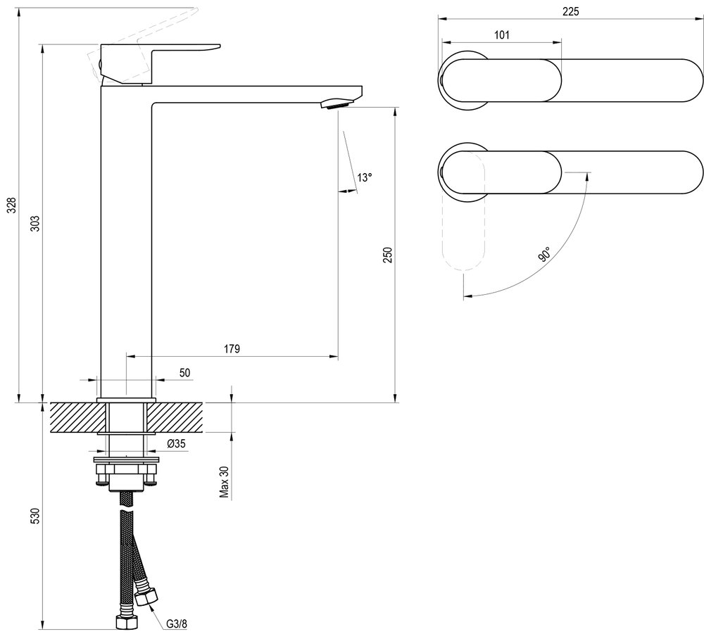 Смесители для умывальника Chrome II производятся с открыванием стока и тросиком либо же без открывания стока. Все смесители имеют керамический картридж диаметром 35 мм, на который мы предоставляем 5 лет гарантии. Они поставляются с уже прикрепленными соединительными шлангами длиной 450 мм диаметром G3/8. Смесители рекомендуем комбинировать с умывальниками серии Chrome или другими умывальниками RAVAK.