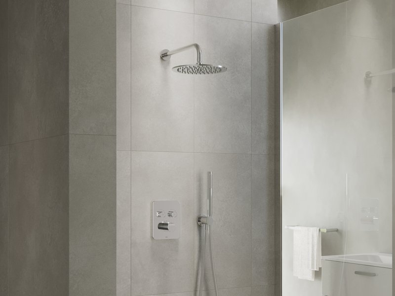 Смеситель скрытого монтажа Flat с переключателем подходит для душевых кабин с фиксированным и ручным душем или для ванн с заполнением переливом с возможностью принятия душа.