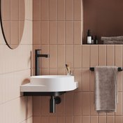 Круглый умывальник дополняется элементом дизайна в виде кронштейна белого цвета, черного или из нержавеющей стали. Магия элегантности объединяет в один тон сочетание кронштейна, смесителя, сифона и слива.