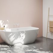 Сочетает в себе преимущества отдельно стоящих и классических ванн. Ее тонкая красота и форма, закругленные углы привлекают к себе внимание. Широкий край у стены позволяет разместить все необходимые Вам при купании вещи.